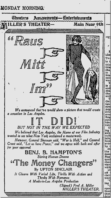 The theater riot is based in part on Hollywood history. When rioters became violent outside Miller's Theater in October of 1921, the management halted their exhibition of The Cabinet of Dr. Caligari after only a few performances, replacing it with silent crime drama The Money Changers. Upton Sinclair may well have become aware of this event because of the fact that the replacement film was based on his own novel of the same name. (As a side note pertaining to my interest in lost films, no reels of The Money Changers are known to have survived.)